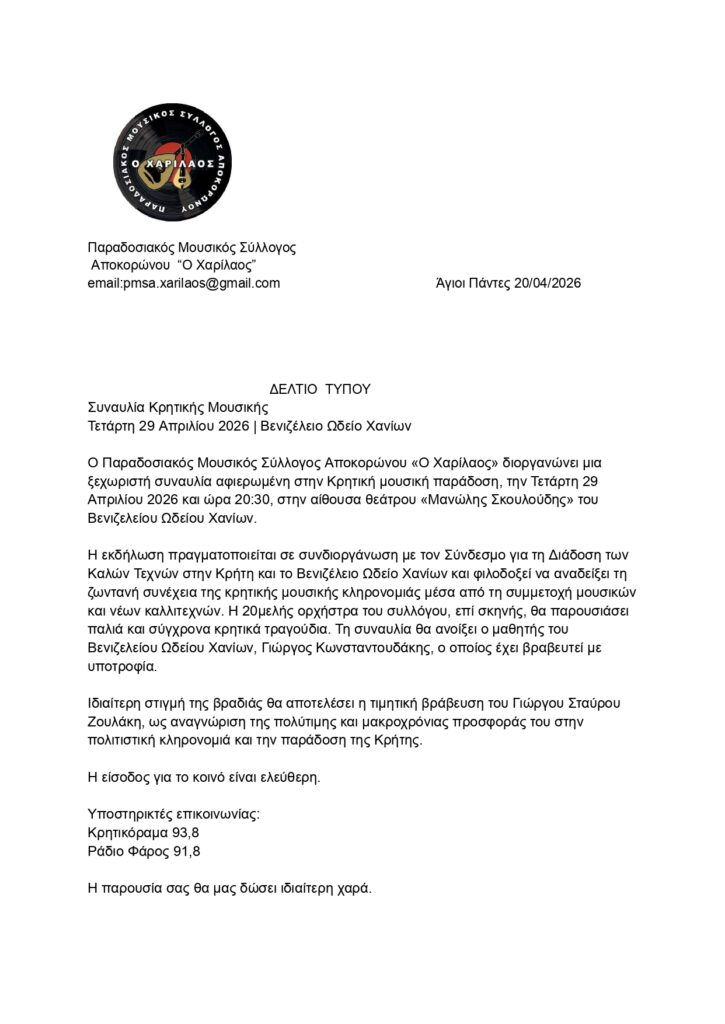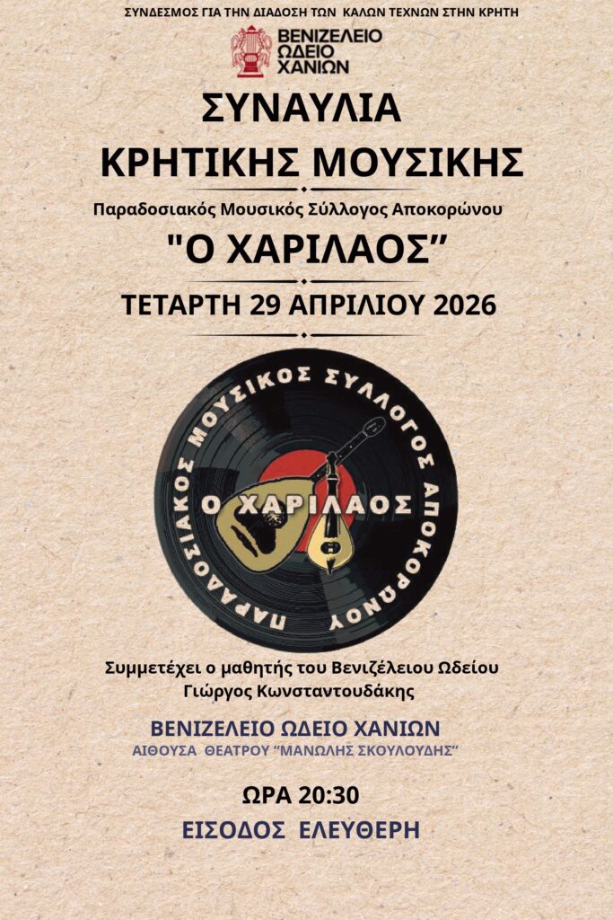 Συναυλία Κρητικής Μουσικής από τον παραδοσιακό μουσικό σύλλογο αποκορώνου ο “Χαρίλαος”
